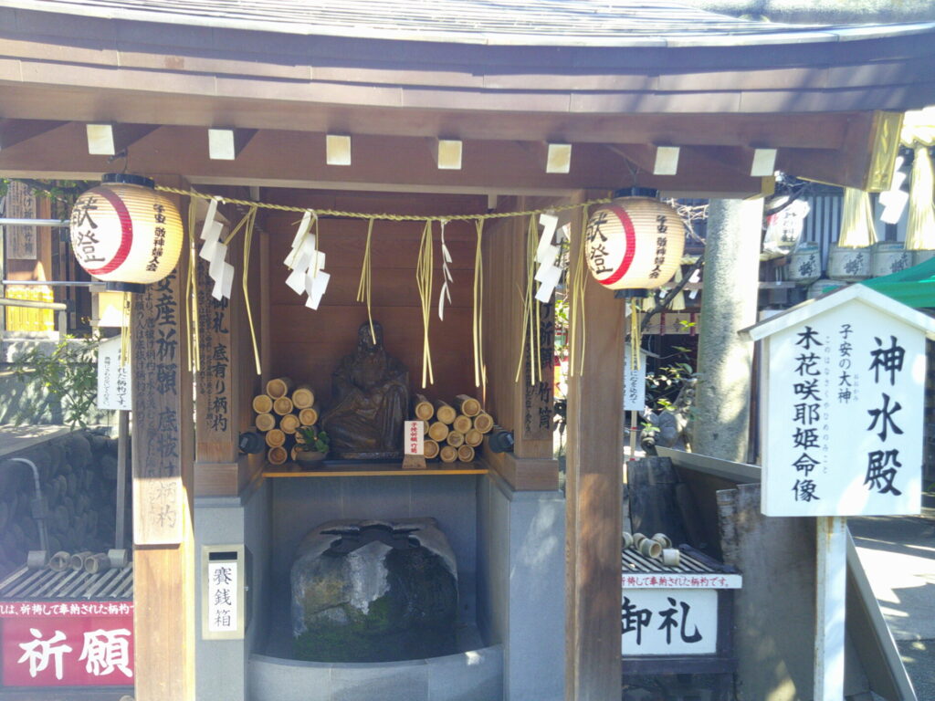 木花開耶姫命像が祀られており、その前にはご神水が湧き出ています