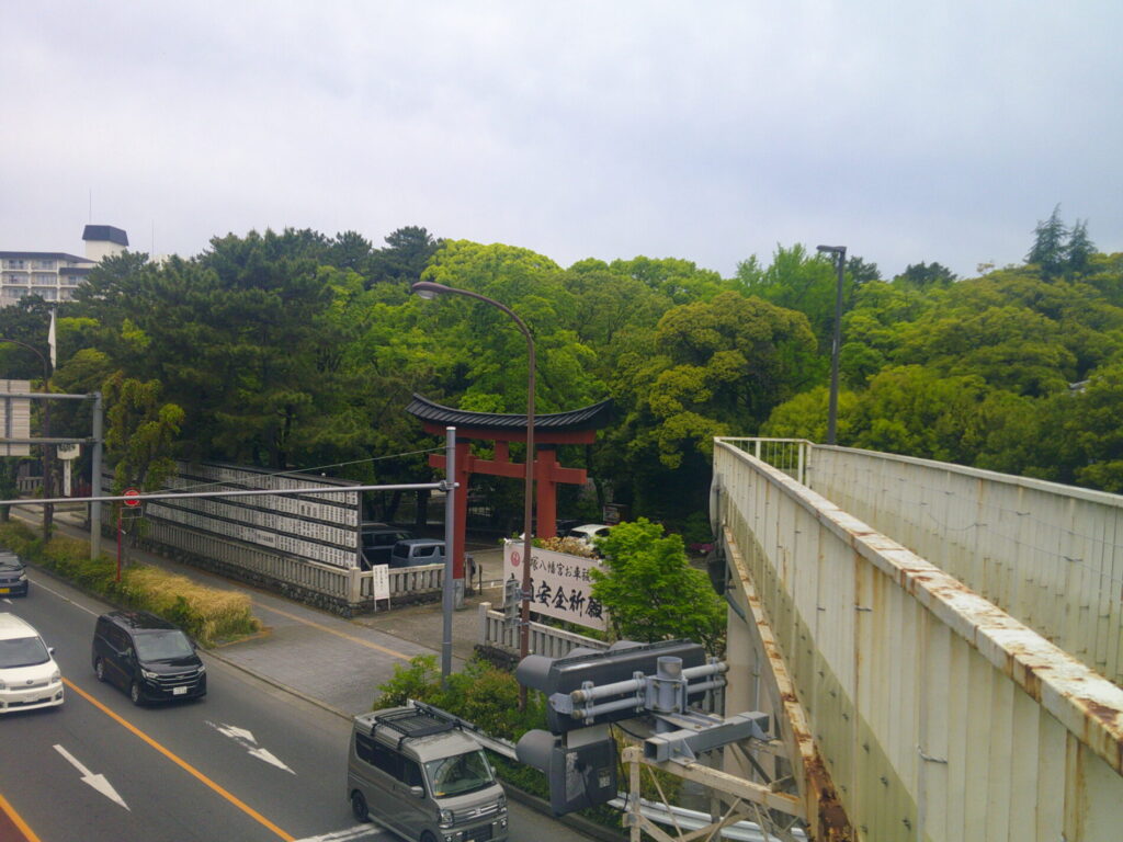 テナントビル群の連なりの先に、杜が見えてきました
