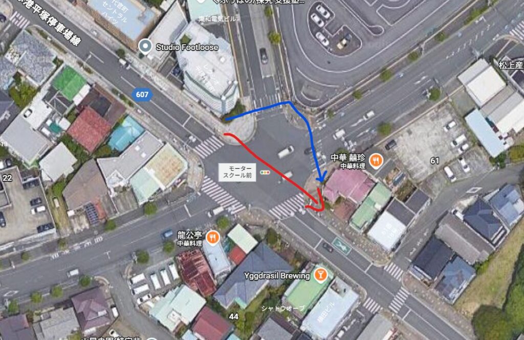 赤のルートが最短なのですが、横断歩道が存在せず、必然青のように迂回を強いられます