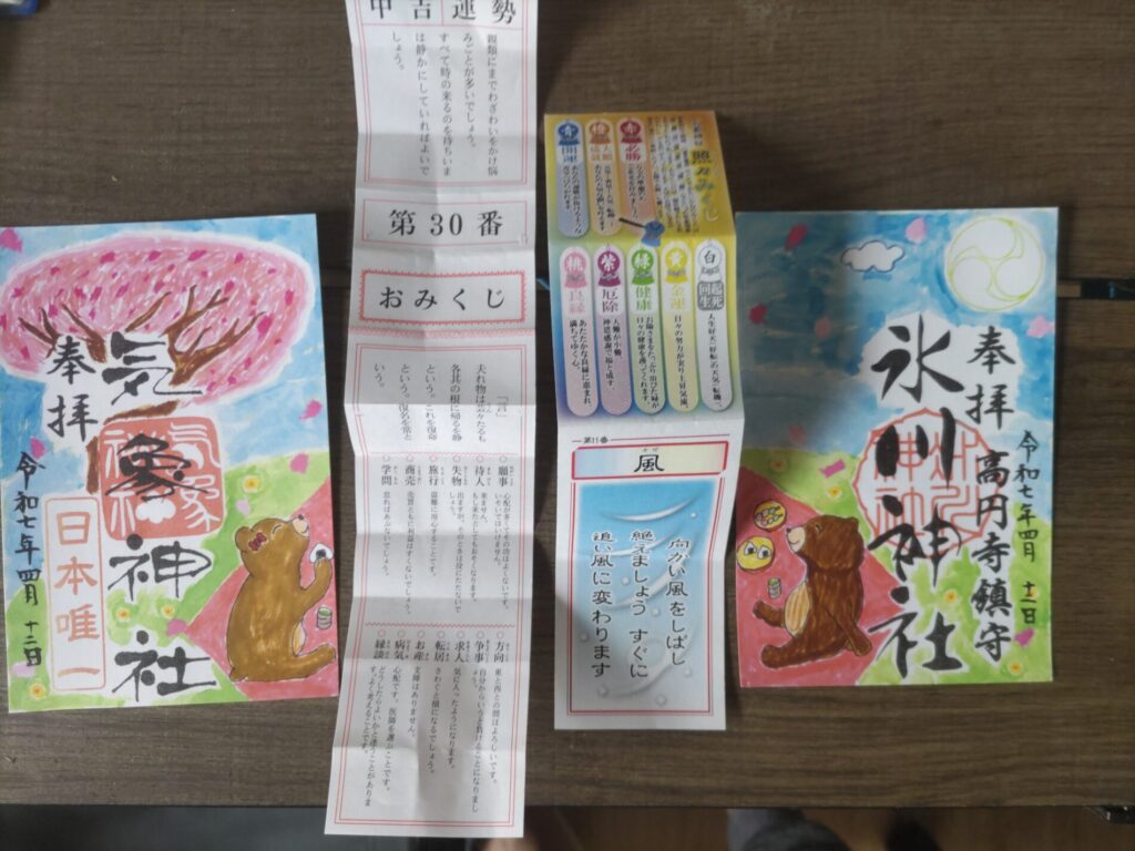 あと、こちらも写真に載せていますが、クマが向かい合っている氷川神社と気象神社の御朱印もお気に入りで、こちらは御朱印帳に張り付けず、部屋に飾ってたりします